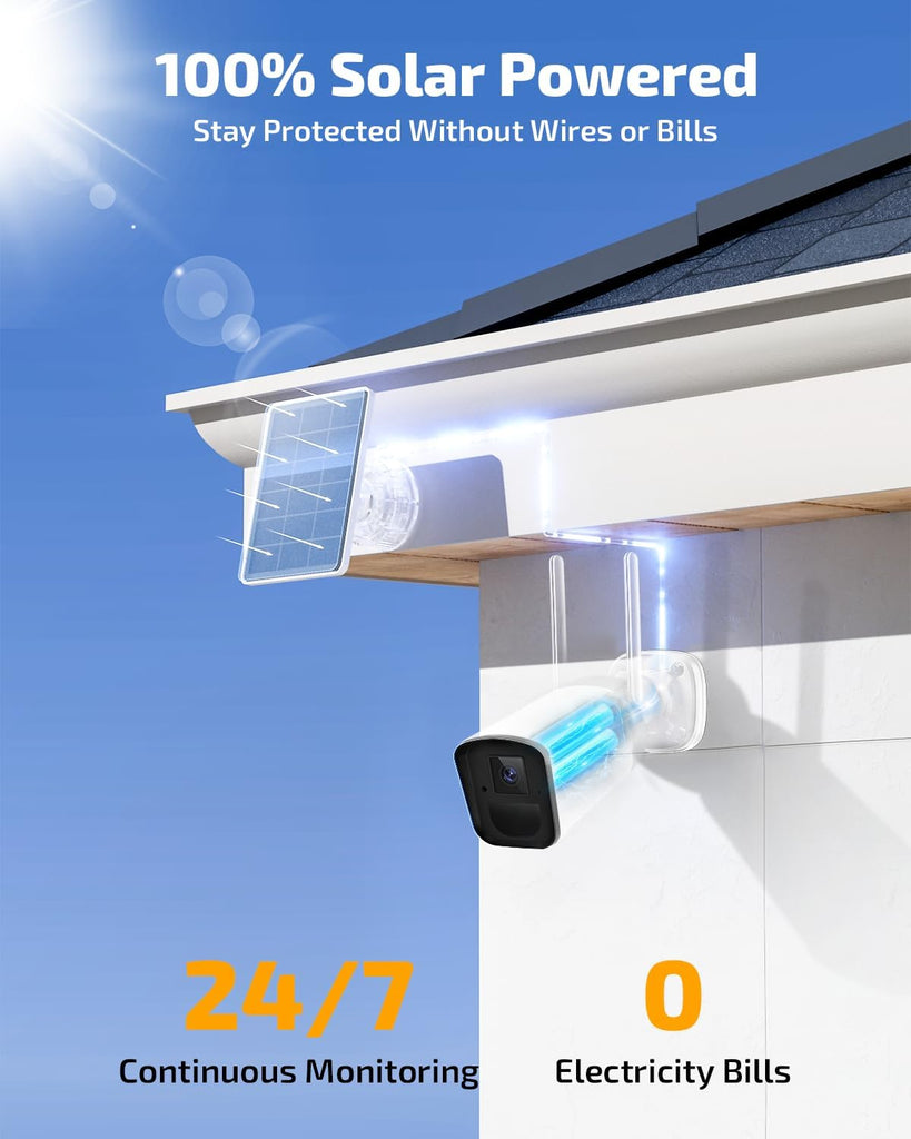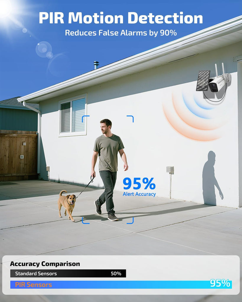 - 《Smart PIR Motion Detection》This solar camera outdoor wireless features PIR motion sensors with intelligent detection that quickly wakes the system and starts recording when movement is detected. No false alarms, no missed moments, keeping your home safe around the clock.