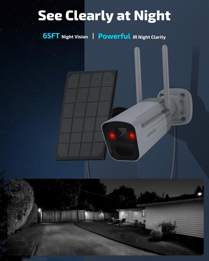 - 《Clear Infrared Night Vision》This solar wireless security camera outdoor provides crisp, detailed video even in complete darkness. With powerful infrared LEDs, it automatically switches to night mode when the light is low, ensuring reliable 24/7 monitoring. A dependable wireless security camera system that keeps your property safe day and night.