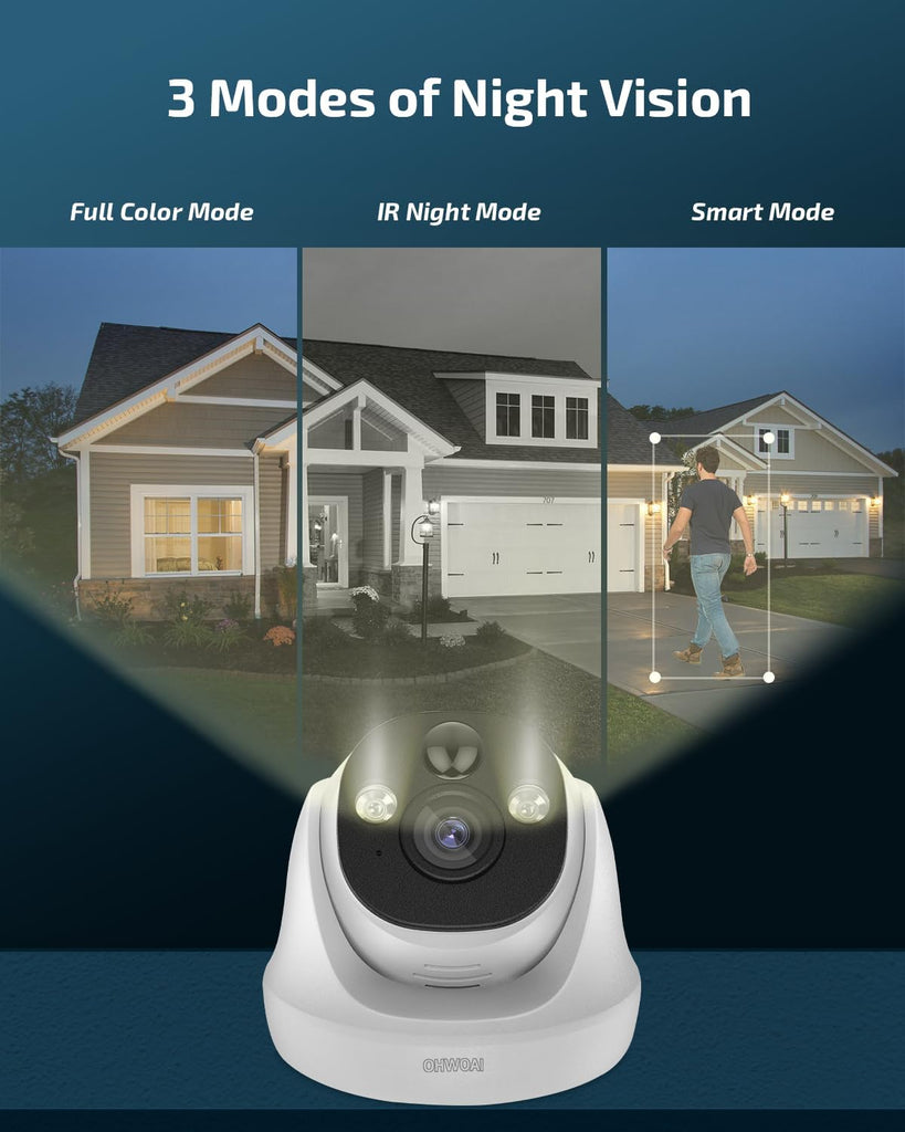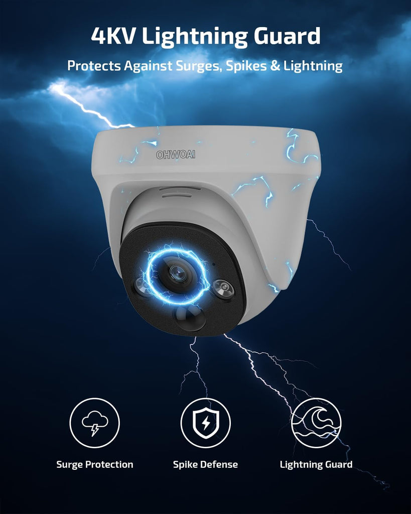 - 《Dual-Light Night Vision》OHWOAI wired security camera system with POE IP cameras features dual light sources: infrared for long-range black & white night vision and white LEDs for full-color video in the dark. Unlike standard cctv cameras, these outdoor surveillance cameras let you clearly identify faces, vehicles, and packages even at night. Perfect for home and business security, ensuring reliable 24/7 protection.