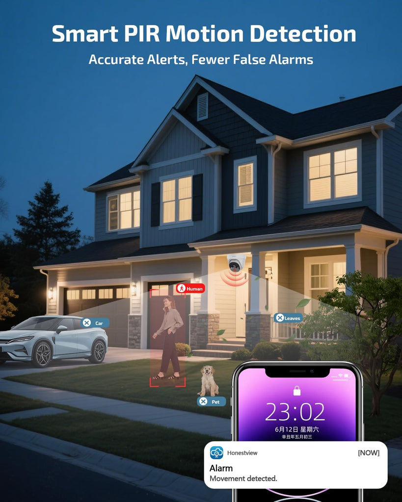 - 《Remote Access with Free App》Stay connected to your home security anytime, anywhere. This 4K POE wired security camera system works with our free mobile app-HonestView, allowing live view and playback on your smartphone, tablet, or PC without hidden charges. Easily share access with family, monitor multiple cameras, and receive real-time motion alerts.