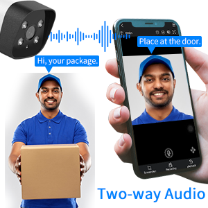 Con la cámara PoE para exteriores, el micrófono y altavoz integrados en la cámara IP permiten un audio bidireccional real. Pueden grabar sonidos en un radio de aproximadamente 35 pies (10 metros). La función de audio bidireccional le permite hablar con quienes están alrededor de la cámara de seguridad 4K en cualquier momento y lugar, tanto para la comunicación familiar como para disuadir amenazas.
