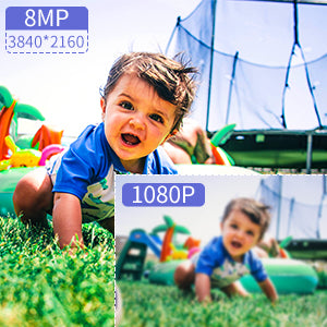 El sistema de cámaras de seguridad con 4 cámaras cuenta con una lente óptica de alta tecnología de 8.0MP y 2160P, proporcionando un marco de súper alta definición de 3840*2160 Mega Píxeles, superior a cámaras de 3.0MP o 5.0MP. Con una cubierta totalmente metálica y clasificación de resistencia al agua IP66, esta cámara puede funcionar bien tanto en interiores como en exteriores.