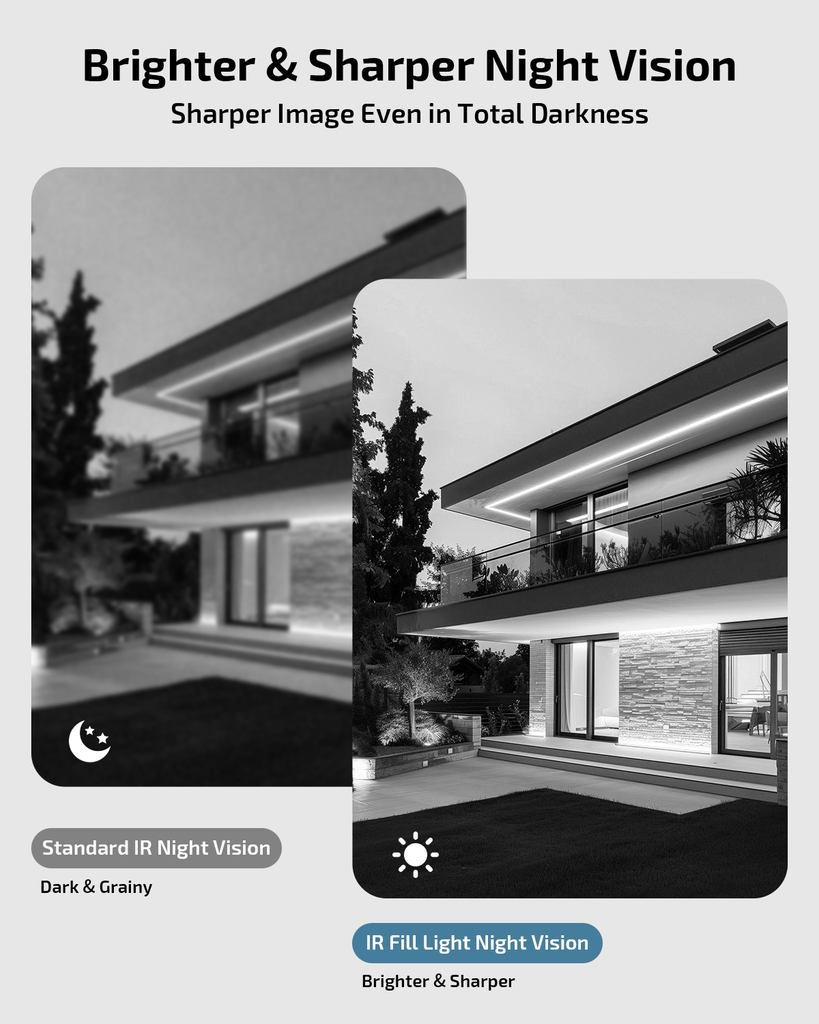 - 《IR Fill Light Night Vision》Equipped with infrared fill lights, cameras deliver bright, noise-free black-and-white night vision. Ideal for low-light areas, outdoor security, and continuous remote monitoring, ensuring clear footage day or night with wired surveillance cameras.